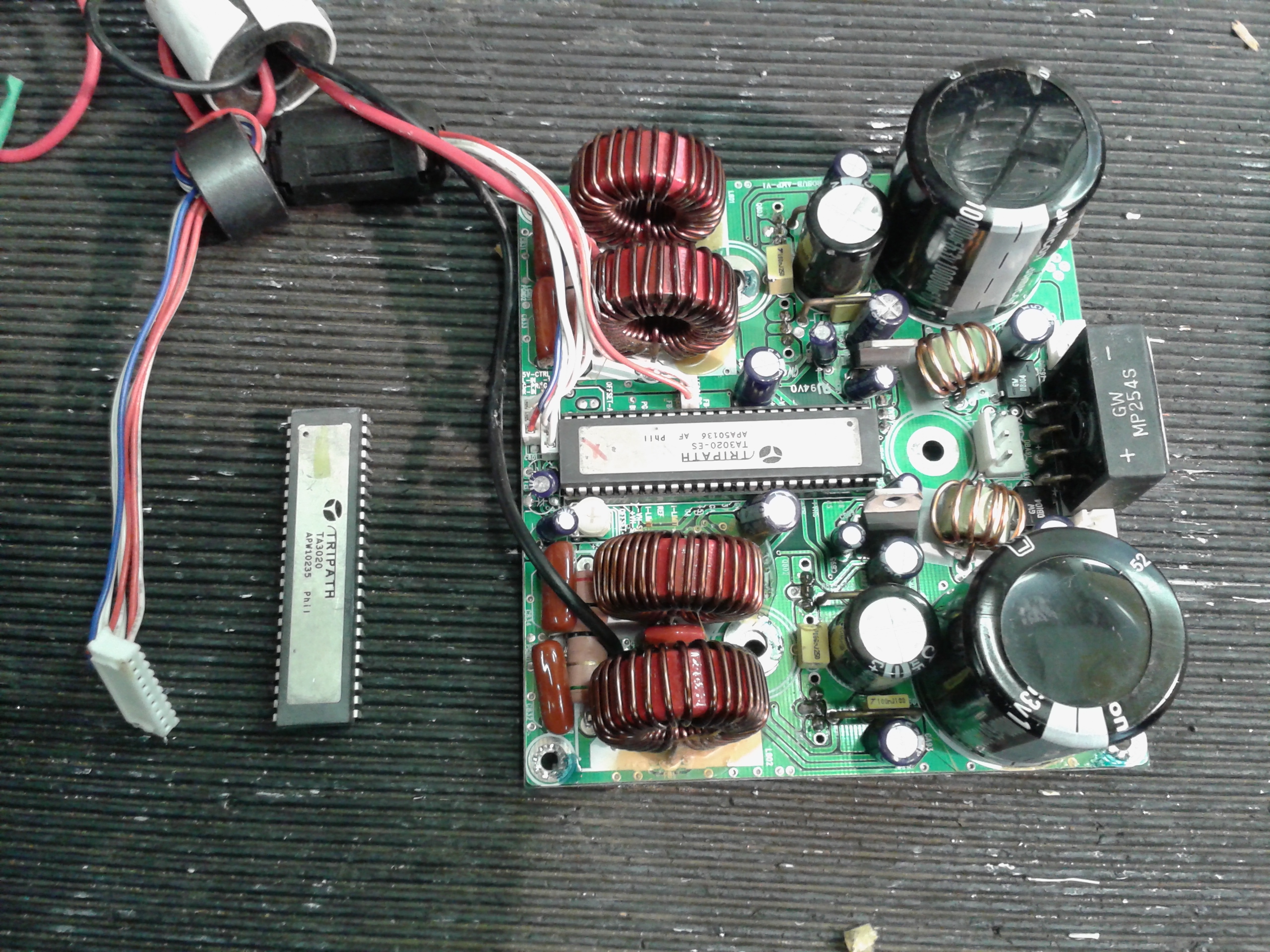 This repair is quite an undertaking and should not even be attempted by a novice and especially without a solder sucking station and a SMC re-work station, the following procedure should be valid for most repairs, as all the units we have ever looked at needed pretty much the same attention. We have not had the luxury of a service manual or schematic to repair these units, however the TRIPATH TA3020 application sheet provides almost all the information needed.